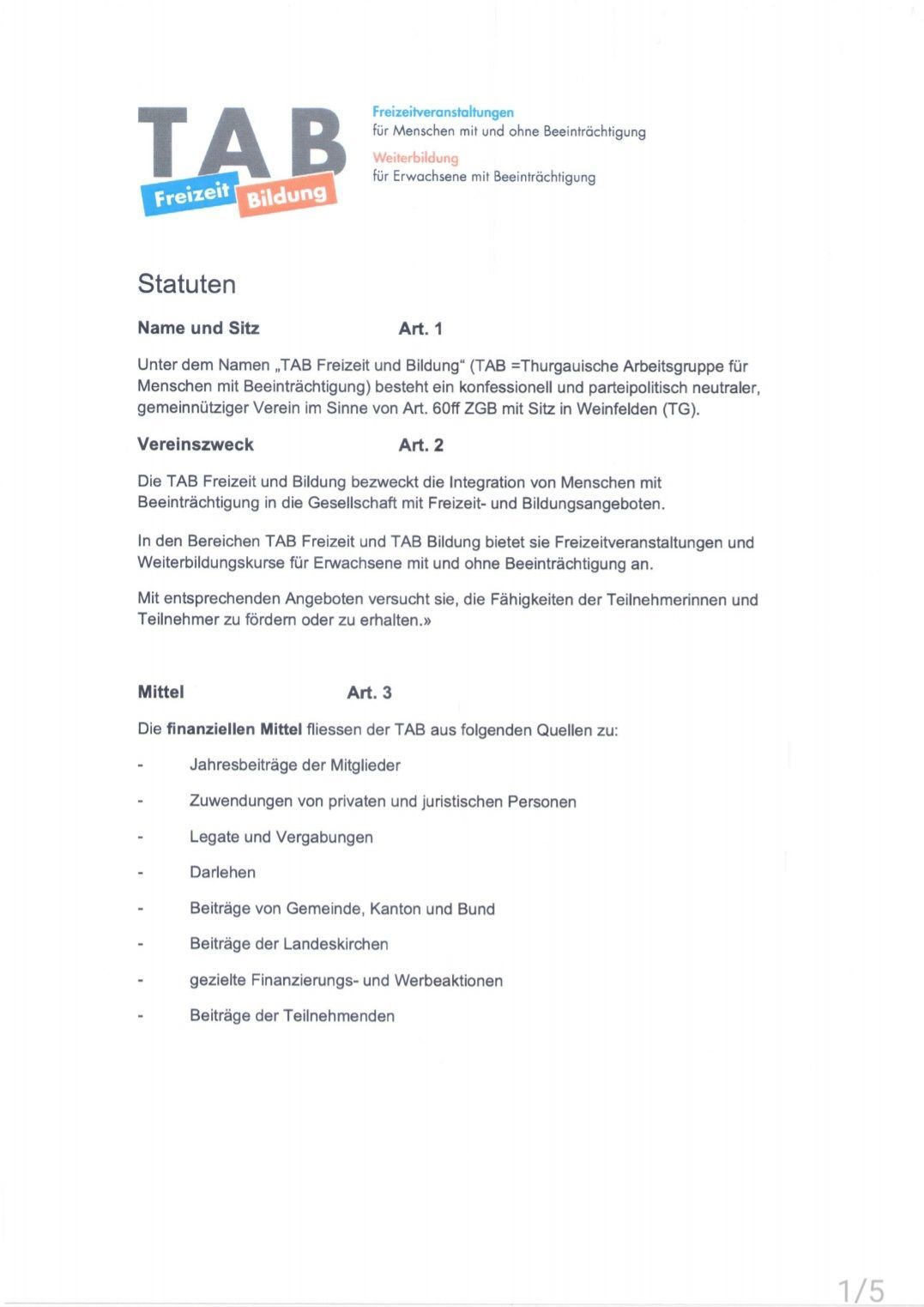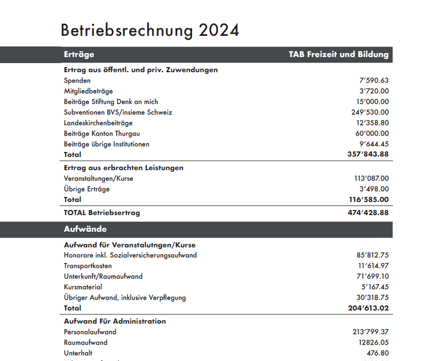 jährlich über 5'000 Stunden ehrenamtlich mit TAB. An vielen Orten kann TAB für wenig Geld Angebote durchführen. Kirchgemeinden, Schulen, Verbände und andere Institutionen unterstützen TAB mit grosszügigen Konditionen. Zusätzlich darf sich TAB auf treue private Spenderinnen und Spender verlassen.